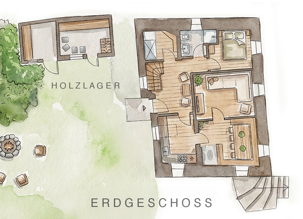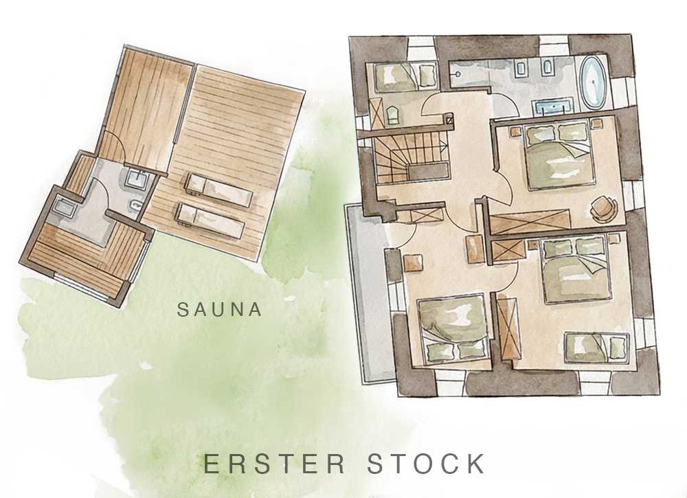 Ein denkmalgeschütztes Haus unter dem Schutz der Heiligen Notburga – das klingt ehrenwert und ernsthaft? Stimmt, und das ist es auch. Und außerdem charmant und einladend, großzügig und entspannend. Und es verwöhnt Sie mit einer fein ausgewogenen Mischung aus Luxus und Tradition. Schlafplätze für sechs bis acht Personen bietet das Chalet Leckplått auf zwei Etagen und 135 Quadratmetern, dazu zwei Bäder, Küche, Wohnzimmer und eine Stube mit der heiß begehrten Ofenbank. Die Mauern sind dick, Fenster und Räume klein und gemütlich, wie in einem Bauernhaus üblich. Besonderes findet sich drunten und draußen: der Felsenkeller zum Weinverkosten, das Sauna- und das Kartenspielerhäuschen und natürlich der Garten, der bis zu den drei Lärchen reicht. Dahinter geht’s zu Chalet Zoila, keine 100 Meter weit.