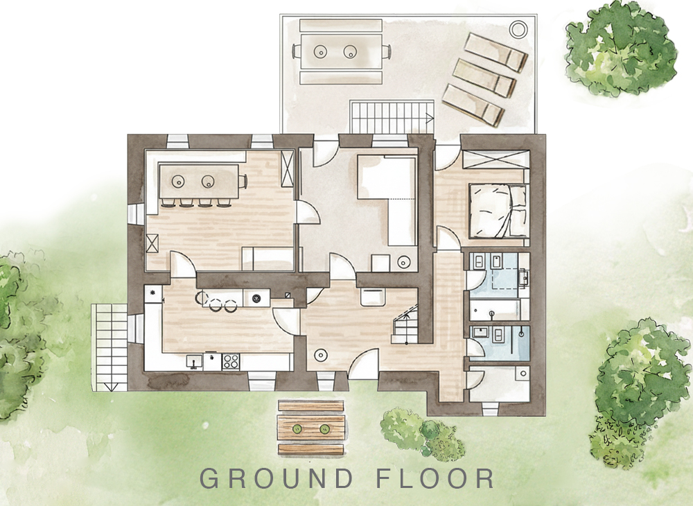 A house with a long and exciting history, which we brought with care and great respect into the 21st century. You can notice that farmers, artisans and a couple of artists have lived here and all have left their mark. The facade of the house faces towards the sun: with a big terrace and many windows to the south that look into the depths of the valleys and the mountains. 170 square meters can accommodate eight to 12 people, with five bedrooms, three bathrooms, kitchen, large living room, plus a “Stube” (lounge) with table and bench for lying down in front of the wood-burning stove. The garden is a gentle slope and just behind the three larch trees, is our Chalet Leckplått.