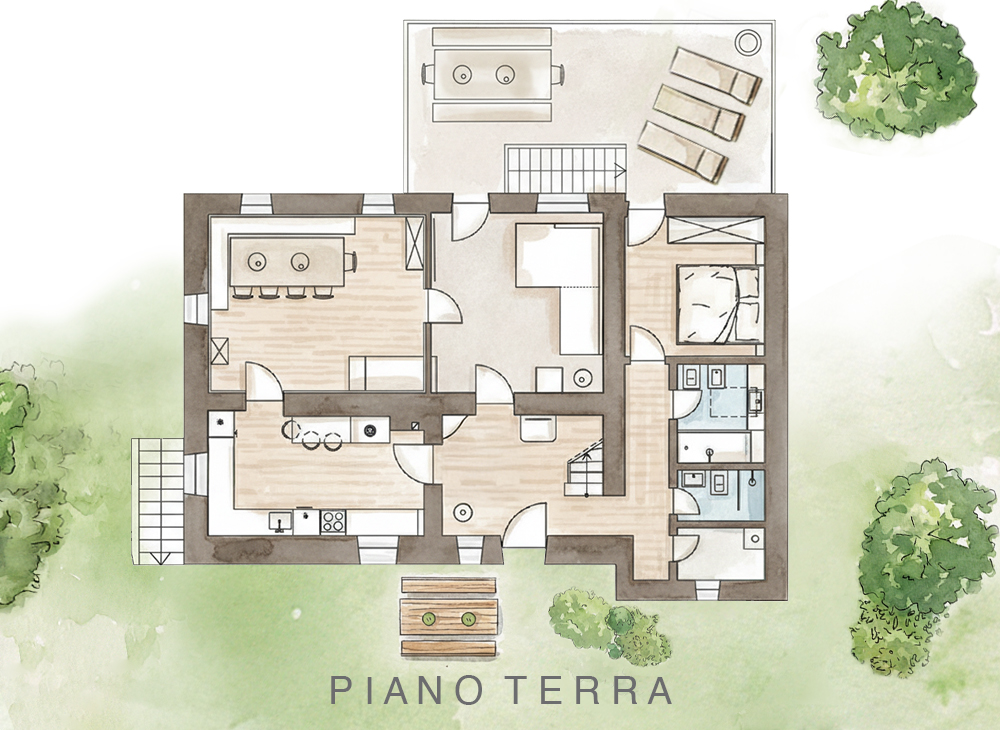 - Uso esclusivo dell’intera zona esterna con sedie a sdraio, mobili da giardino in legno e casetta di giochi