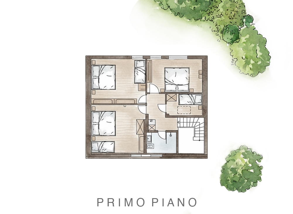 Quattro camere da letto sono situate al primo piano, una al piano terra. Due camere sono dotate di nuovi letti Boxspring, nelle altre stanze le reti dei letti sono state restaurate ed il tutto combinato con nuove mensole e guardarobe in pregiato legno. Le aste delle tende sono stati progettati insieme ad un interior designer, i tessuti selezionati accuratamente.